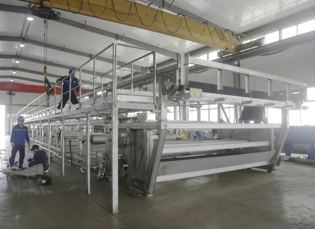 本合同設(shè)備(橡膠帶式真空過(guò)濾機(jī))用于塞爾維亞半水二水濕法磷酸項(xiàng)目半水磷酸反應(yīng)料漿的過(guò)濾,項(xiàng)目地點(diǎn)位于塞爾維亞。車(chē)間積極響應(yīng),迅速行動(dòng),全體員工凝心聚力,團(tuán)結(jié)一致,以飽滿(mǎn)的熱情投身到工作之中,迅速掀起生產(chǎn)大干的熱潮。與此同時(shí),為了適應(yīng)市場(chǎng),實(shí)現(xiàn)設(shè)備高效、低碳、節(jié)能目標(biāo),由核盛團(tuán)隊(duì)全新自主研發(fā)的——帶式真空加壓深度脫水一體機(jī),目前已生產(chǎn)組裝完畢,投入試驗(yàn)狀態(tài)。 該設(shè)備采用前段真空負(fù)壓預(yù)脫水、中段履帶保壓式正壓進(jìn)一步脫水、后段使用橡膠復(fù)合真空輥剪切力的對(duì)輥碾壓進(jìn)行深度脫水,可最大限度去除水份。該設(shè)備自動(dòng)化程度高,可實(shí)現(xiàn)全自動(dòng)運(yùn)行,能完成連續(xù)喂料、過(guò)濾、洗滌、壓榨、濾布再生等功能,維護(hù)方便、生產(chǎn)效率、濾餅含水率極低,可解決很多行業(yè)在使用固液分離設(shè)備上的痛點(diǎn),為客戶(hù)創(chuàng)造價(jià)值!相信該新產(chǎn)品一旦投放到市場(chǎng),將會(huì)成為核盛新的經(jīng)濟(jì)增長(zhǎng)點(diǎn)。