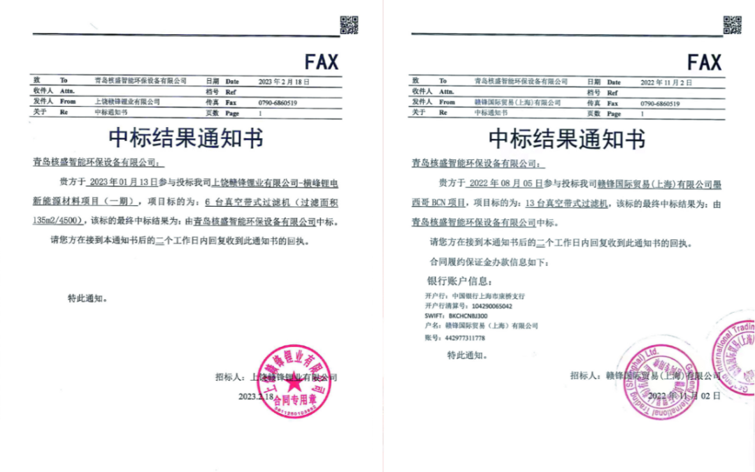 熱烈慶祝我司2023年2月18日再次中標(biāo)中國“鋰王”贛鋒鋰業(yè)大項目(六臺套超大型帶式真空過濾機,過濾面積135平平方米/4500),加上2022年11月份中標(biāo)的贛鋒鋰業(yè)墨西哥項目(13臺套100平方帶式真空過濾機),設(shè)備總臺數(shù)達(dá)19臺套,兩次中標(biāo)是行業(yè)龍頭贛鋒鋰業(yè)對我司綜合能力的肯定,彰顯了公司技術(shù)和實力。這預(yù)示我司在鋰電新能源行業(yè)取得了優(yōu)異成績和重大突破,為公司進(jìn)一步開拓市場夯實基礎(chǔ)。核盛裝備,將為中國鋰電新能源行業(yè)裝備做出更大貢獻(xiàn)!