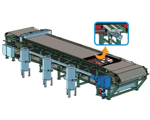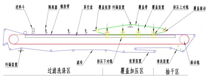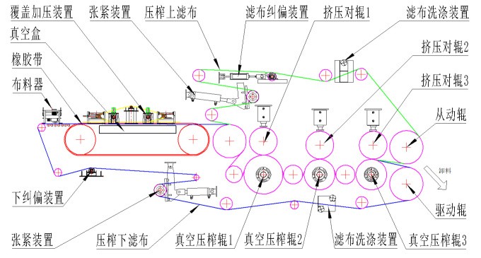 智能壓榨過(guò)濾機(jī)的過(guò)濾單元由交替排列的隔膜濾板和廂式濾板以及夾在其間的過(guò)濾介質(zhì)構(gòu)成的多組濾室,每組濾室容積可在一定范圍內(nèi)改變。工作時(shí),由供料泵將漿料壓入濾室形成流體壓力,濾液穿過(guò)濾布并沿濾板的導(dǎo)流間隙流至濾板邊角通道,集中排出,固體顆粒被截留在濾布上形成濾餅,直至積滿濾室,過(guò)濾完畢。之后壓榨介質(zhì)(水或氣)由壓榨通道進(jìn)入隔膜腔并形成壓力,將濾餅中殘液擠出經(jīng)導(dǎo)流間隙至邊角通道。隨后通入高壓空氣至濾餅一側(cè),在壓力的作用下,氣流穿過(guò)濾餅并帶走殘液。濾板整體拉開(kāi)卸除濾渣,清洗濾布,重新壓緊濾板,開(kāi)始下一工作循環(huán)。